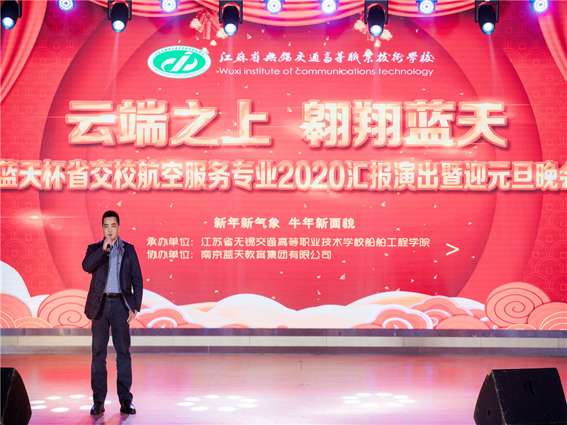 129日晚,船舶工程学院在校大礼堂举办了“蓝天杯”航空服务专业2020汇报演出暨迎元旦晚会,欢送我校首届航空服务专业毕业生。学校党委书记、校长李虎,副校长倪依纯,船舶工程学院院长,船舶工程学院党总支副书记,学校各处室、院部的领导,教师代表、学生代表以及航空服务专业的家长代表出席了本次活动。泰州职业技术学院党委副书记钟文乐、经济管理学院党总支书记展凯,南京蓝天教育集团董事长朱正华,副总经理安宏林及南京金陵高职校工作站主任刘恋应邀出席了本次活动。