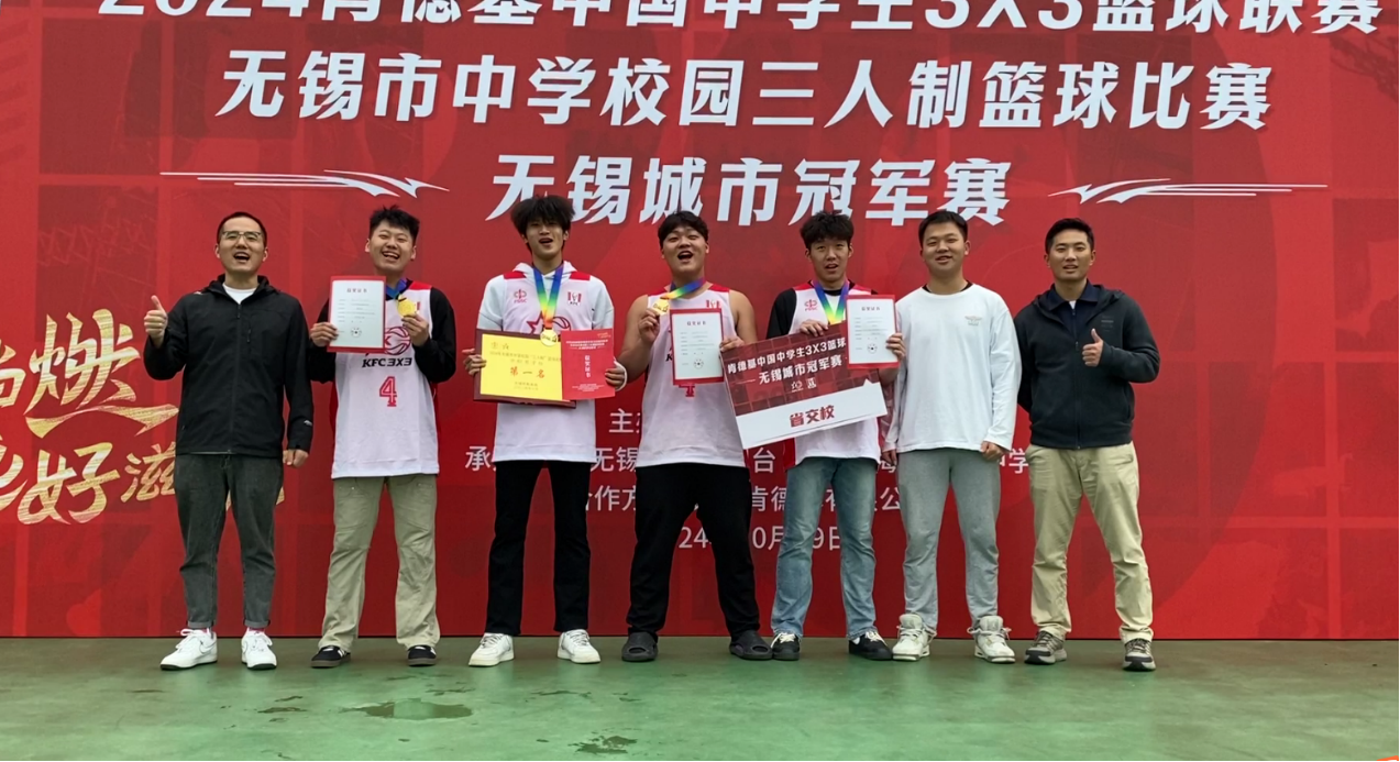 10月19日,2024年无锡市中学校园三人制篮球比赛暨肯德基无锡城市冠军赛在无锡市梅村高级中学火热开赛,比赛共吸引全市高中、中职阶段40余支队伍参加。经过激烈比拼,学校男子篮球队队荣获中职组冠军,交通工程学院李成功获得本届赛事“最有价值球员”称号,徐斌老师获“优秀教练员”称号。这也是继6月份五人制篮球赛荣获无锡市冠军后,学校男篮再次荣获冠军。