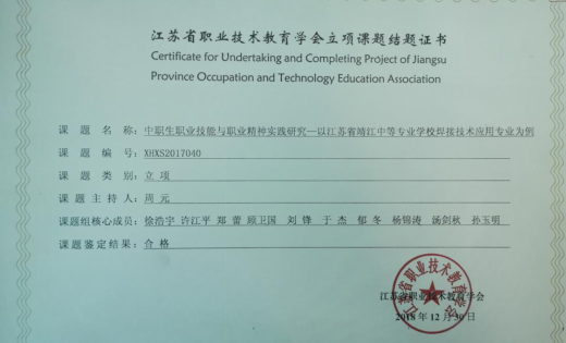 结业证书-中职生职业技能与职业精神实践研究——以江苏省靖江中等专业学校焊接技术应用专业为例