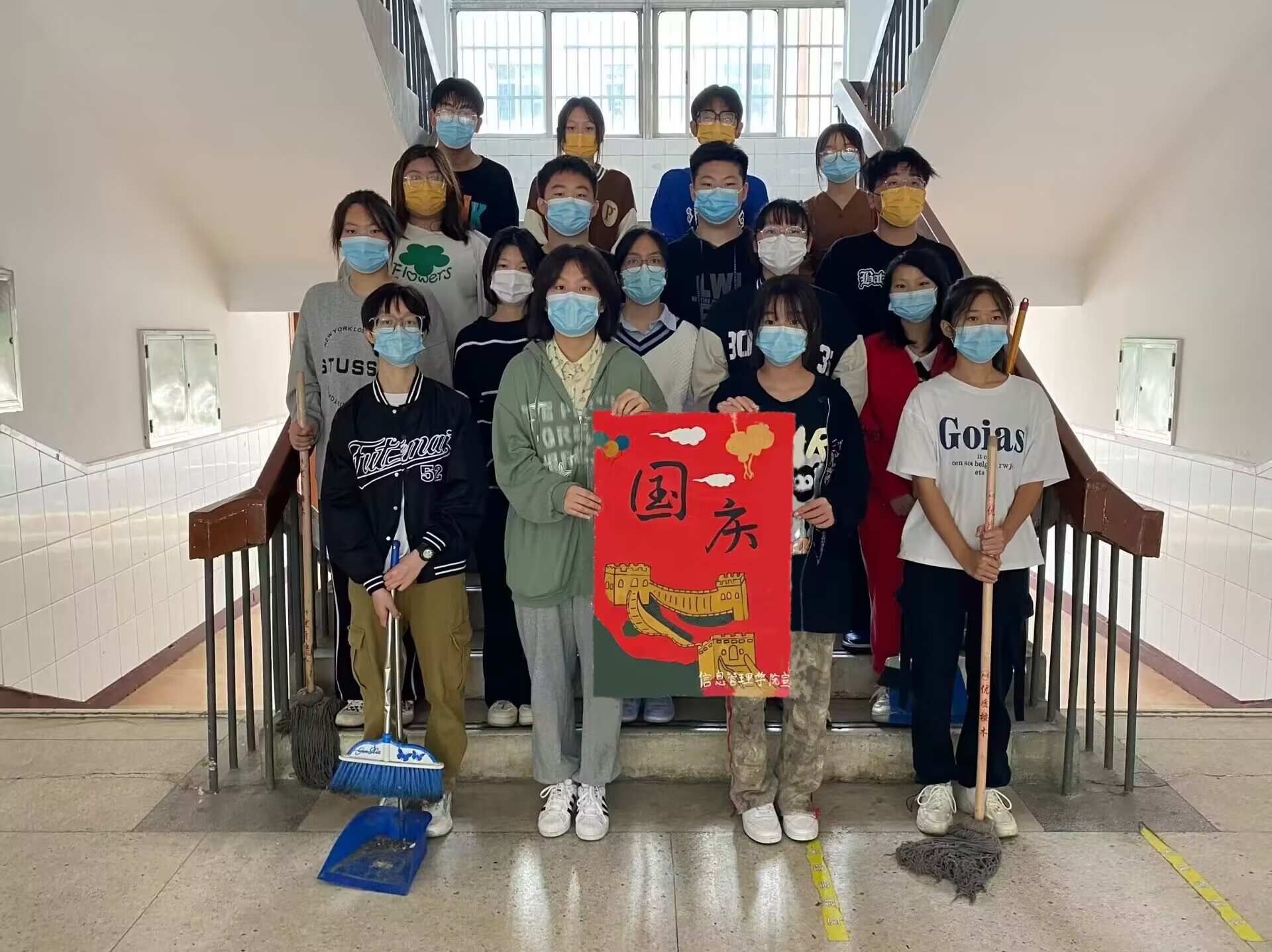 为了让同学们在洁净、祥和的气氛中欢度国庆,共创舒适、文明、和谐的校园环境,提高学生的环保意识与劳动意识。2022106日,信息管理学院在正德楼组织学生开展“清洁校园,喜迎国庆”主题活动。