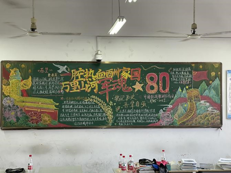 为引导青年学子铭记历史荣光、传承抗战精神,学院根据学校安排精心组织此次主题板报创作活动,25级各班师生协同构思、分工协作。在252311班级的板报前,“一腔热血酬家国,万里山河军魂”十三个遒劲大字格外醒目,下方通过麦穗、和平鸽、鲜花串联起华表、天安门广场、万里长城等中国的鲜明图景,表达“先辈用热血守山河,我们以匠心兴中华”的信念。