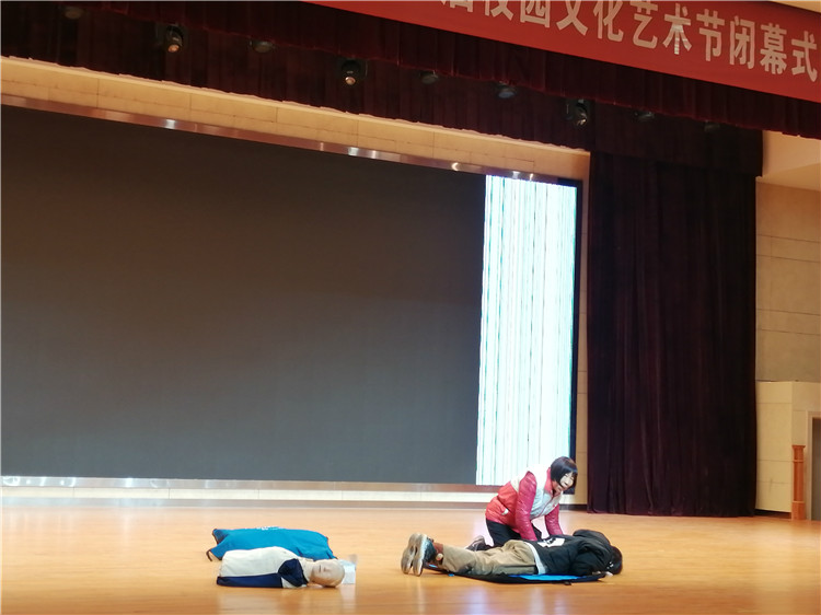 红十字会孙老师用通俗、风趣的语言,重点围绕心肺复苏、创伤救护、意外伤害、心血管疾病防治等内容为学员们展开讲解,并用模拟人进行示范演示,师生们听得十分认真,在实操环节积极动手练习,老师现场指导纠正学员出现的错误操作,帮助学生掌握心肺复苏和包扎的基本技能。课程结束后,进行了心肺复苏和包扎的现场操作考核。